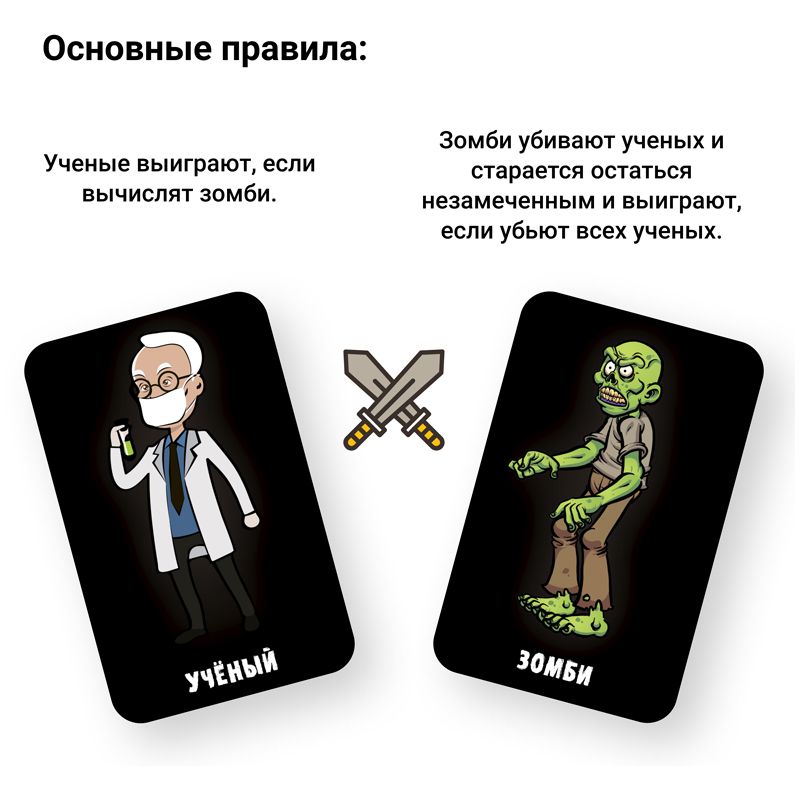 Задача “Ученых” заработать баллы, выполняя разнообразные испытания в квесте и вычислить “Зомби”, который пытается остаться незамеченными и заразить команду ученых создающих вакцину.