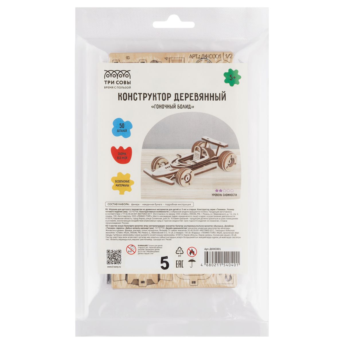 Конструктор деревянный ТРИ СОВЫ "Гоночный болид",10*5,7*3см, 50 деталей, пакет с еврослотом