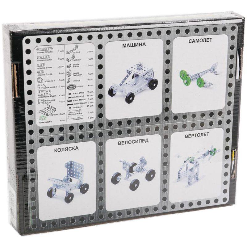 Металлический конструктор «10К» №2 для уроков труда, артикул 02078, включает в себя 155 деталей, из которых можно собрать 5 моделей: машинка, коляска, самолет, вертолет и велосипед.