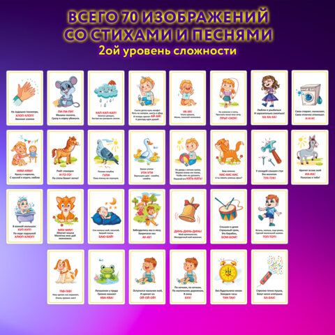 Карточки для развития речи ЗВУКОПОДРАЖАНИЕ, 70 картинок, 10х15 см, 310 г/м2, ЮНЛАНДИЯ, 691021