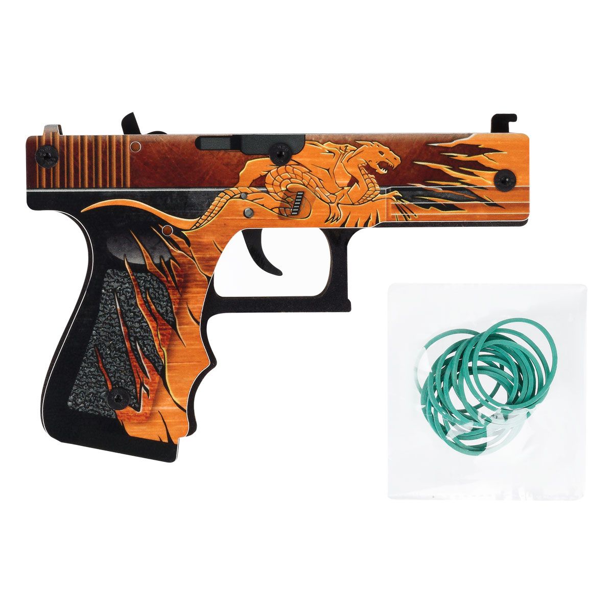 Деревянный пистолет Glock-18 порадует высоким качеством, ярким исполнением и безопасностью. Настоящее игровое оружие - пистолет- резинкострел. Он заряжается резинками до 8 штук с дальностью стрельбы до 10 метров. Пистолет абсолютно безопасен для детей и походит для активных игр, как дома, так и на улице. В наборе включены деревянные мишени, извлекаются из подложки пистолета. Деревянное оружие окрашено с помощью стойкого и яркого пигмента, выглядит настоящим произведением искусства, а его поверхность имеет неповторимый рисунок. Важно помнить, что сделан из дерева и требует аккуратного обращения. Не стоит подвергать изделие чрезмерным механическим нагрузкам. Без съемного магазина для резинок.
