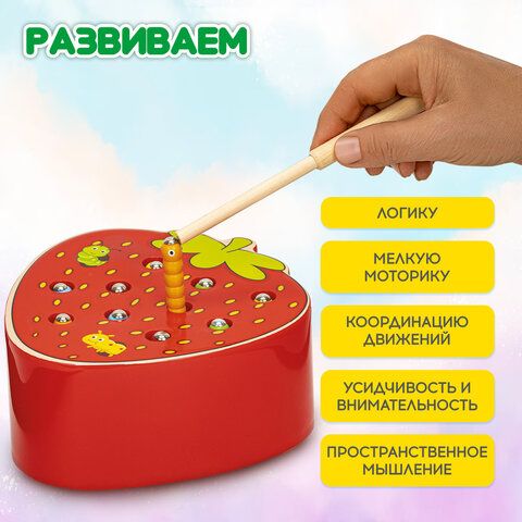 Сортер-рыбалка магнитный деревянный развивающий "Клубника", BRAUBERG KIDS, 665245