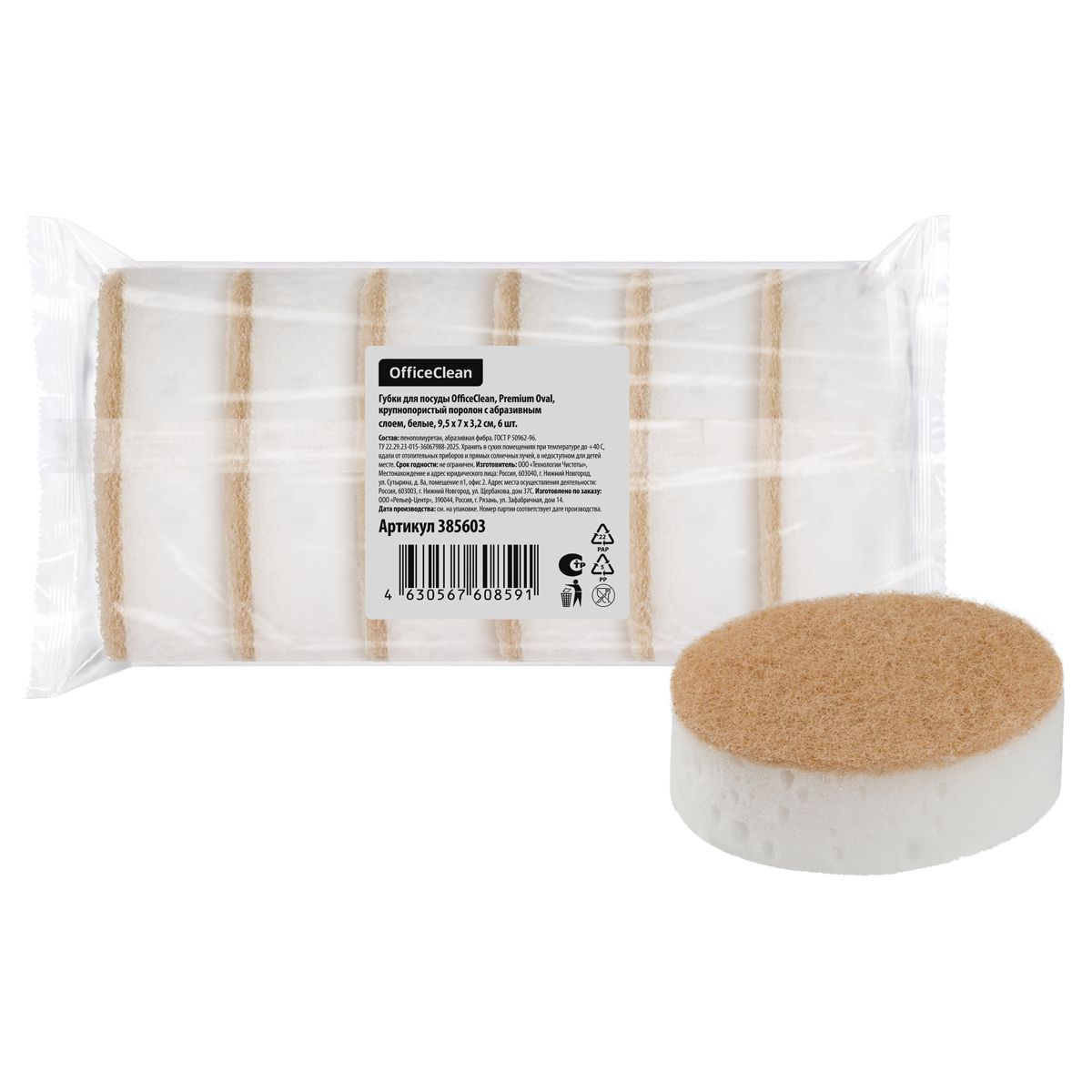 Губки для посуды OfficeClean "Премиум", овал, крупнопористый поролон с абразивным слоем, белые, 9,5*7*3,2см, 6шт