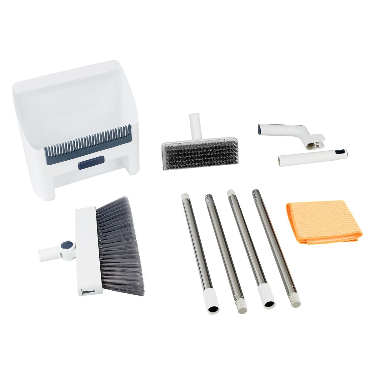Комплект состоит из 4 элементов: совок, мягкая щетка, жесткая щетка, водосгон. Водосгон крепится в специальное отверстие на мягкой щетке.