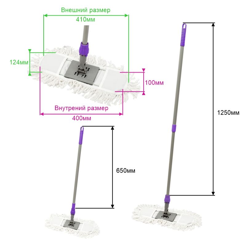 Тип швабры: швабра-рамка складная. Тип крепления насадки: карманы. Тип крепления рукоятки: резьба 2,2 см, стяжная гайка. Диаметр рукоятки: 2,2 см. Максимальная длина рукоятки: 125 см. Минимальная длина рукоятки: 65 см. Размер насадки внешний: 41 х 12,4 см. Размер насадки внутренний: 40 х 10 см. Длина ворса: 3 - 5,5 см. Материал насадки: хлопок, полиэстер. Материал рукоятки: металл. Материал держателя: металл, пластик. Вес: 540 г. Сменная насадка: 303084.