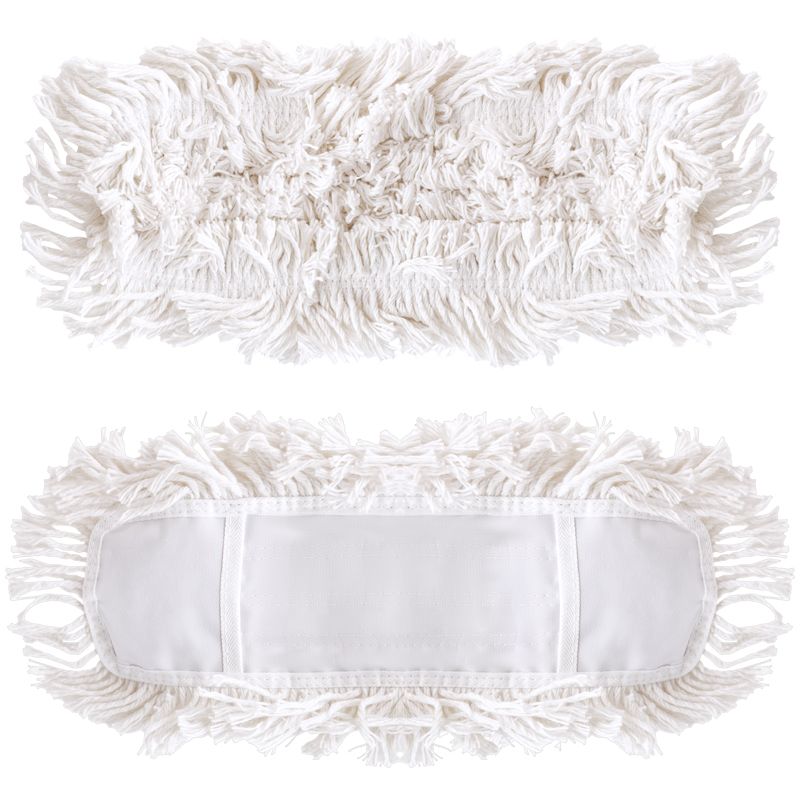 Насадка (МОП) изготовлена из хлопка с длинным ворсом. Хлопок дает высокую гигроскопичность насадке, при сухой уборке насадка хорошо убирает пыль, не позволяя ей разлетаться, а при влажной уборке отлично впитывает воду, не оставляя разводов на полу. Благодаря тому, что насадка изготовлена не из 100% хлопка, а с добавлением полиэстера - это дает ей высокую стойкость к истиранию, при этом она хорошо скользит по полу, собирает грязь, мелкий мусор, песок, шерсть домашних животных. Насадка может крепиться к держателю швабры при помощи карманов или ушей. Отжим насадки производится вручную.