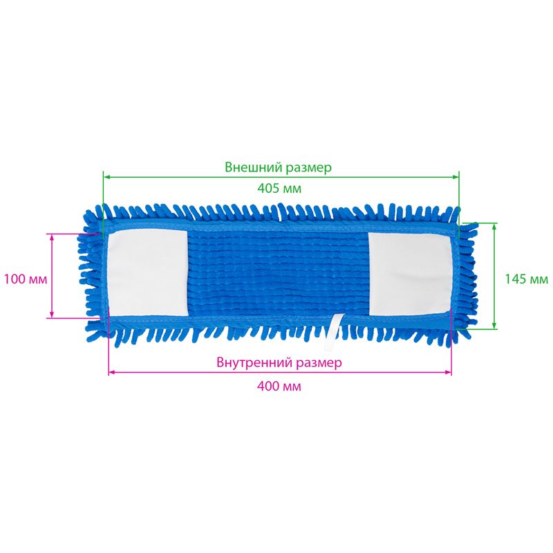 Тип насадки: плоская для складного флаундера. Материал: ворсистая микрофибра. Крепление насадки: карманы. Максимальный объем впитывания: 400 мл. Размер насадки внешний: 40,5 х 12,5 см. Размер насадки внутренний: 40 х 10 см. Длина ворса: 2 см. Цвет: синий. Вес: 100 г. Подходит к швабре (Код: 303056) и флаундеру (Код: 303090, 303091).