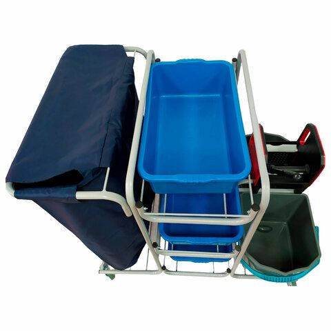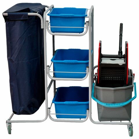 - Многофункциональные комплексы: оснащены держателями для инвентаря, корзинами и мешками для мусора, превращая тележку в мобильную станцию для клининга.