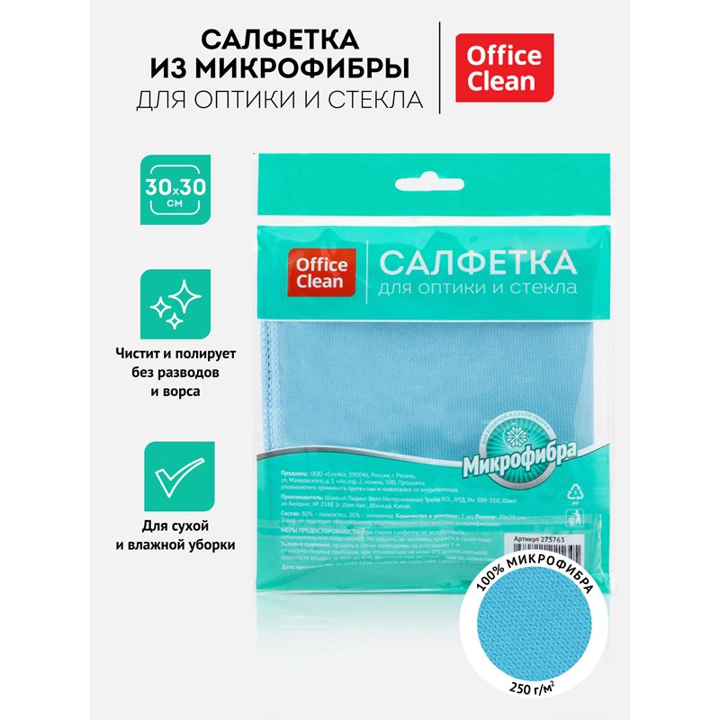 Салфетка для оптики и стекла OfficeClean, плотная микрофибра, 30*30см, синяя