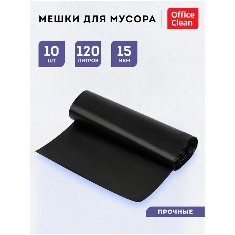 Мешки для мусора 120л OfficeClean ПНД, 70*110см, 15мкм, 10шт., прочные, черные, в рулоне