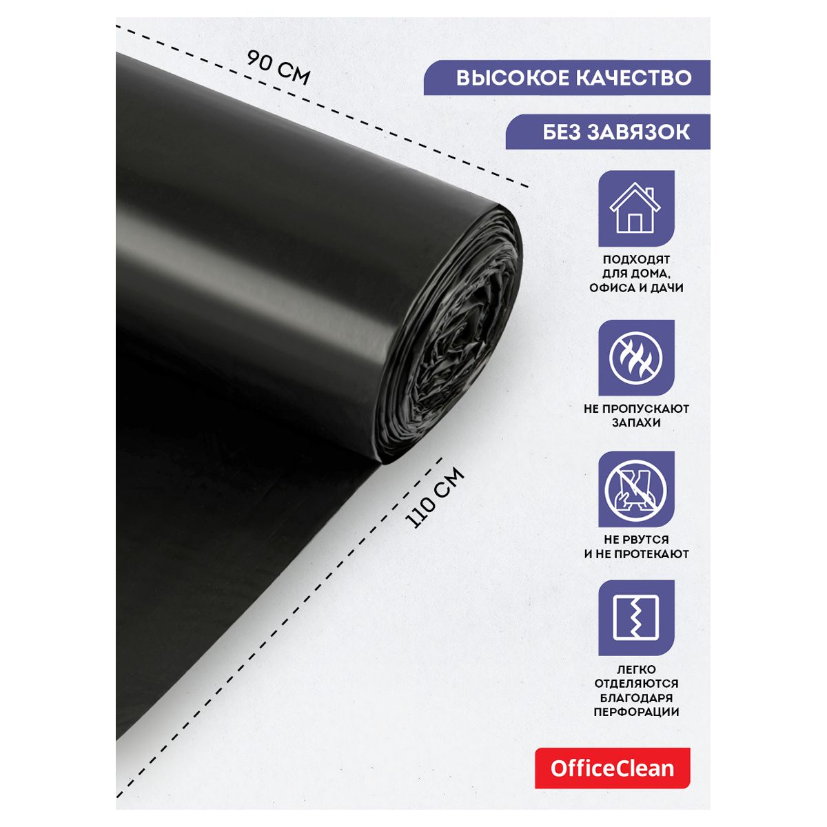 Мешки для мусора 180л OfficeClean ПВД, 90*110см, 35мкм, 10шт., черные, в рулоне