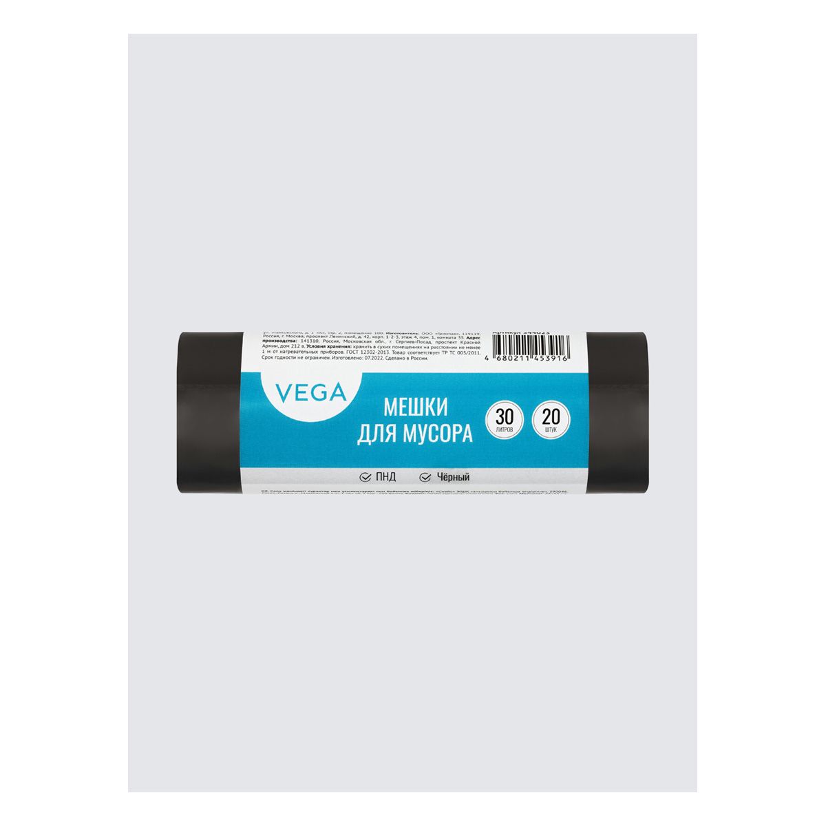 Мешки для мусора 30л Vega ПНД, 48*55см, 5мкм, 20шт., черные, в рулоне