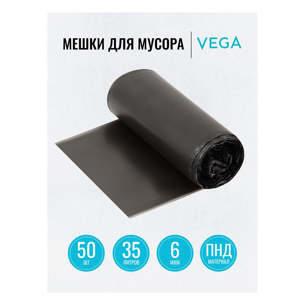 Мешки для мусора 35л Vega ПНД, 50*60см, 6мкм, 50шт., черные, в рулоне