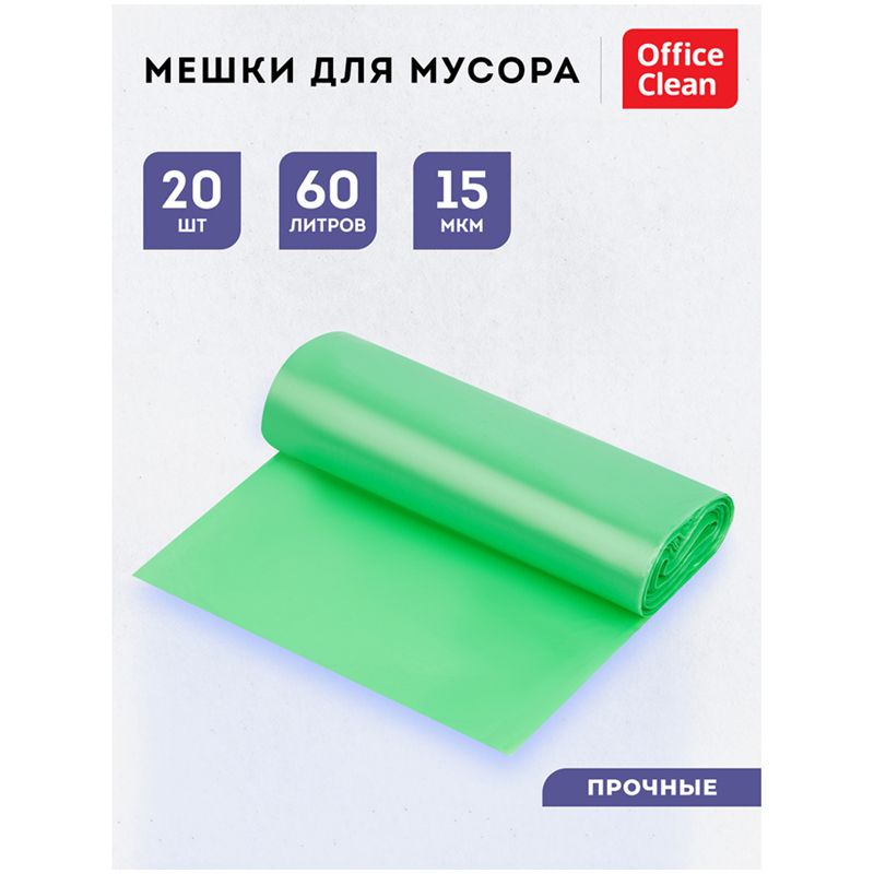 Мешки для мусора 60л OfficeClean биоразлагаемые, ПНД, 60*70см, 15мкм, 20шт., прочные, зеленые, в рулоне