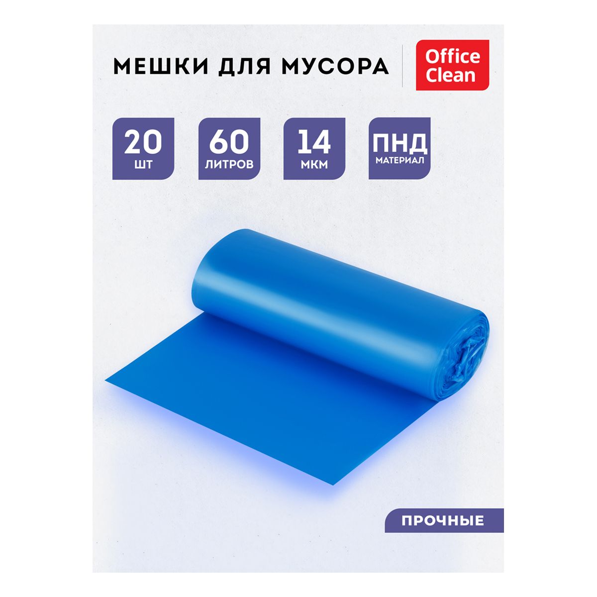 Мешки для мусора 60л OfficeClean ПНД, 60*76см, 14мкм, 20шт., прочные, синие, в рулоне, с ушками