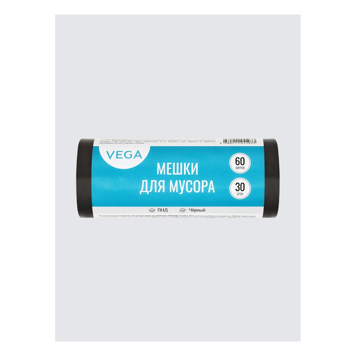 Мешки для мусора 60л Vega ПНД, 60*70см, 8мкм, 30шт., черные, в рулоне