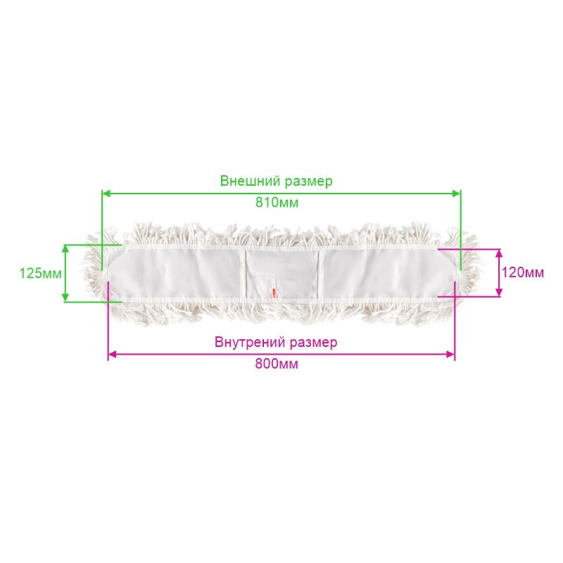 Насадка (МОП) изготовлена из хлопка с длинным ворсом. Хлопок дает высокую гигроскопичность насадке, при сухой уборке насадка хорошо убирает пыль, не позволяя ей разлетаться, а при влажной уборке отлично впитывает воду, не оставляя разводов на полу. Благодаря тому, что насадка изготовлена не из 100% хлопка, а с добавлением полиэстера - это дает ей высокую стойкость к истиранию, при этом она хорошо скользит по полу, собирает грязь, мелкий мусор, песок, шерсть домашних животных. Насадка крепится к держателю швабры при помощи карманов. Отжим насадки производится вручную.