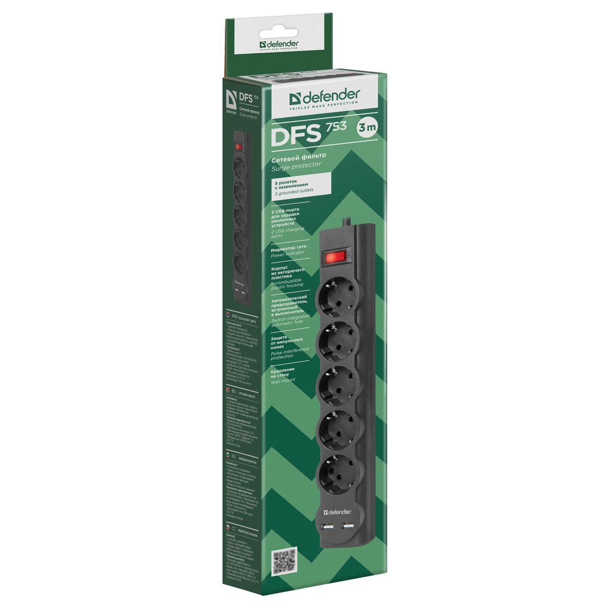Сетевой фильтр Defender DFS 753 5 розеток 3,0м, 2xUSB, 2.1A, черный