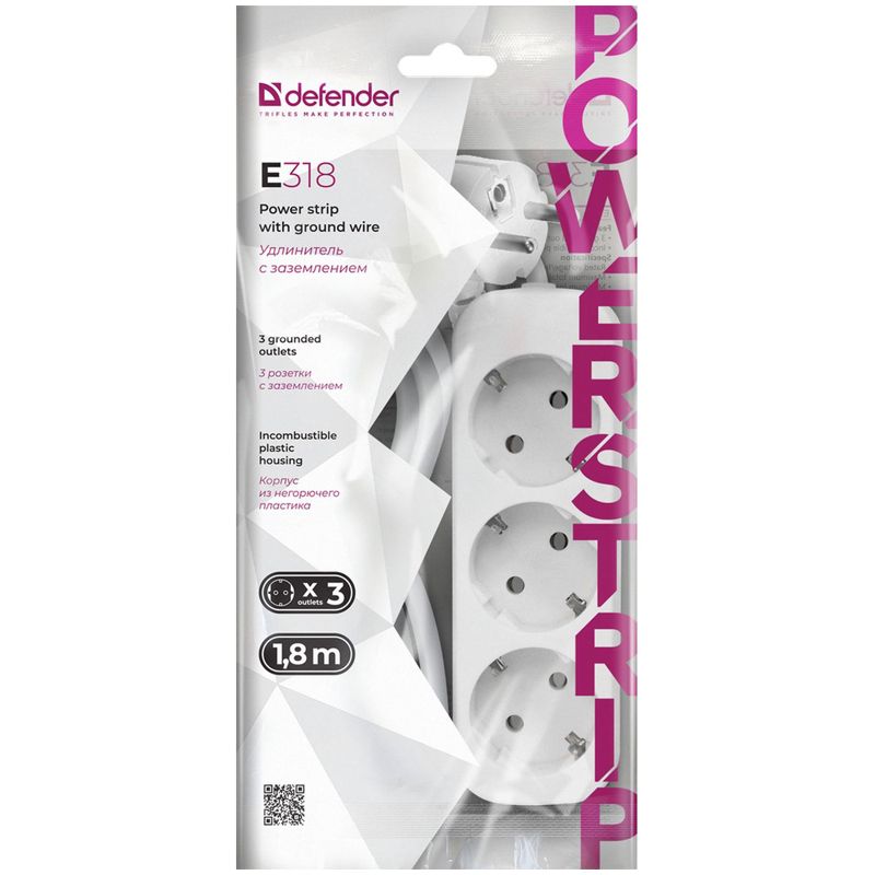 Удлинитель Defender E318, 3 розетки, с заземлением, 1,8м, белый