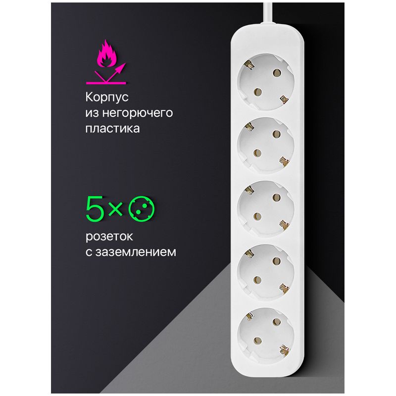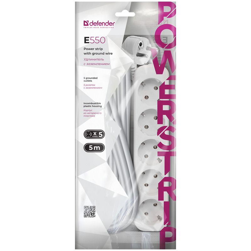 Удлинитель Defender E550, 5 розеток, с заземлением, 5м, белый