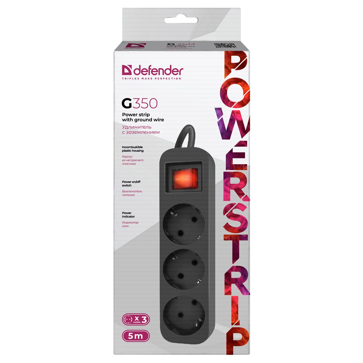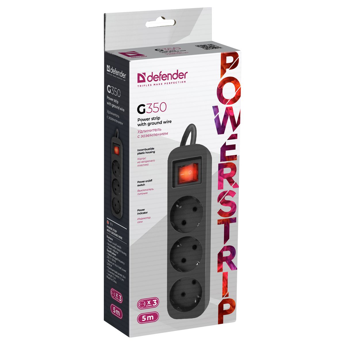 Удлинитель Defender G350, 3 розетки, с заземлением, выключатель, 5м, черный