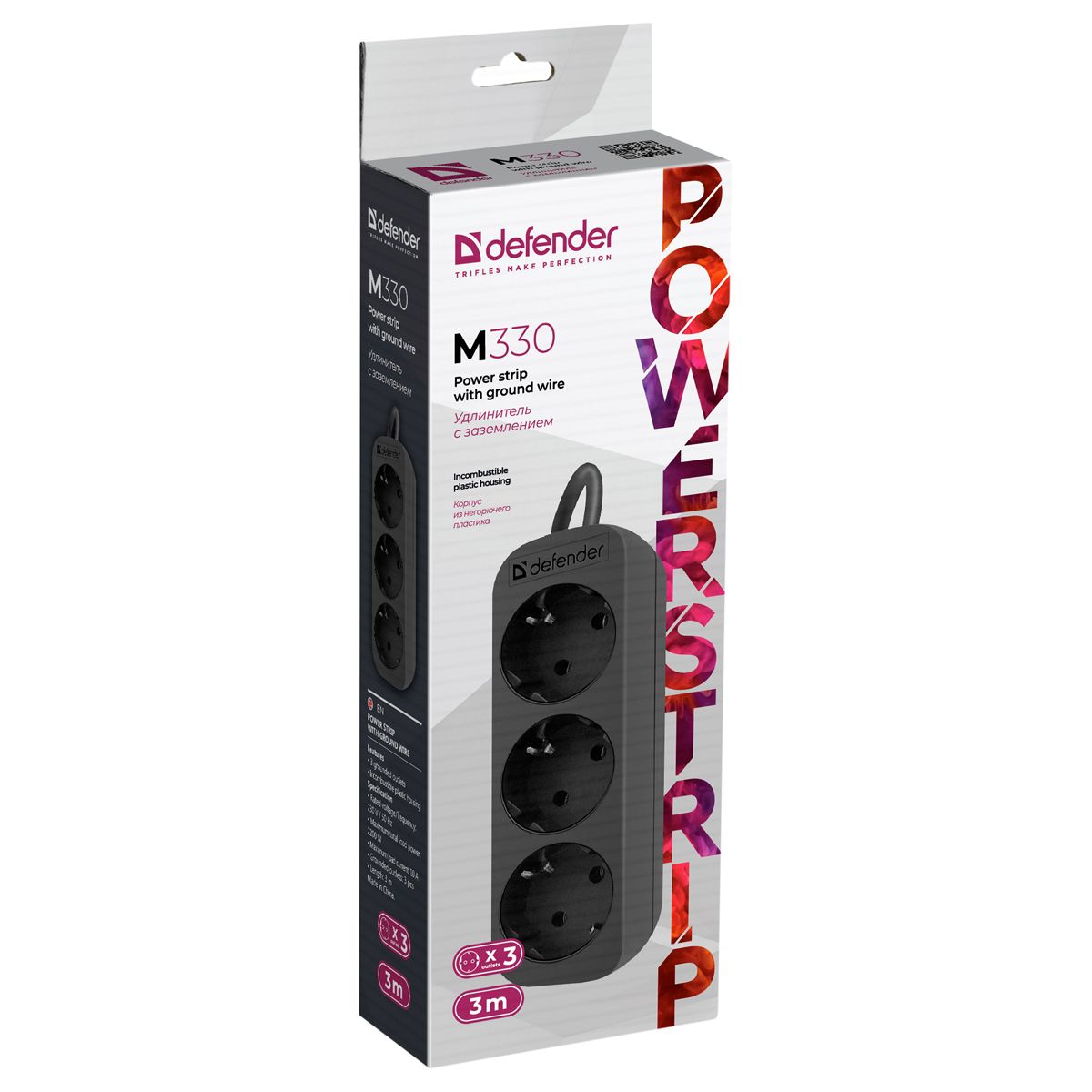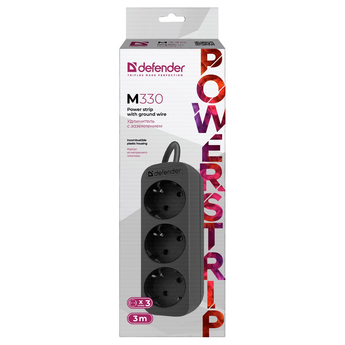 Удлинитель Defender M330, 3 розетки, с заземлением, 3м, черный