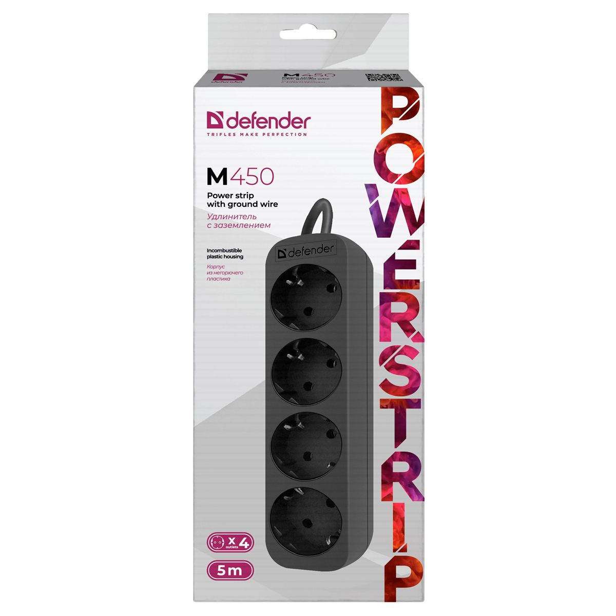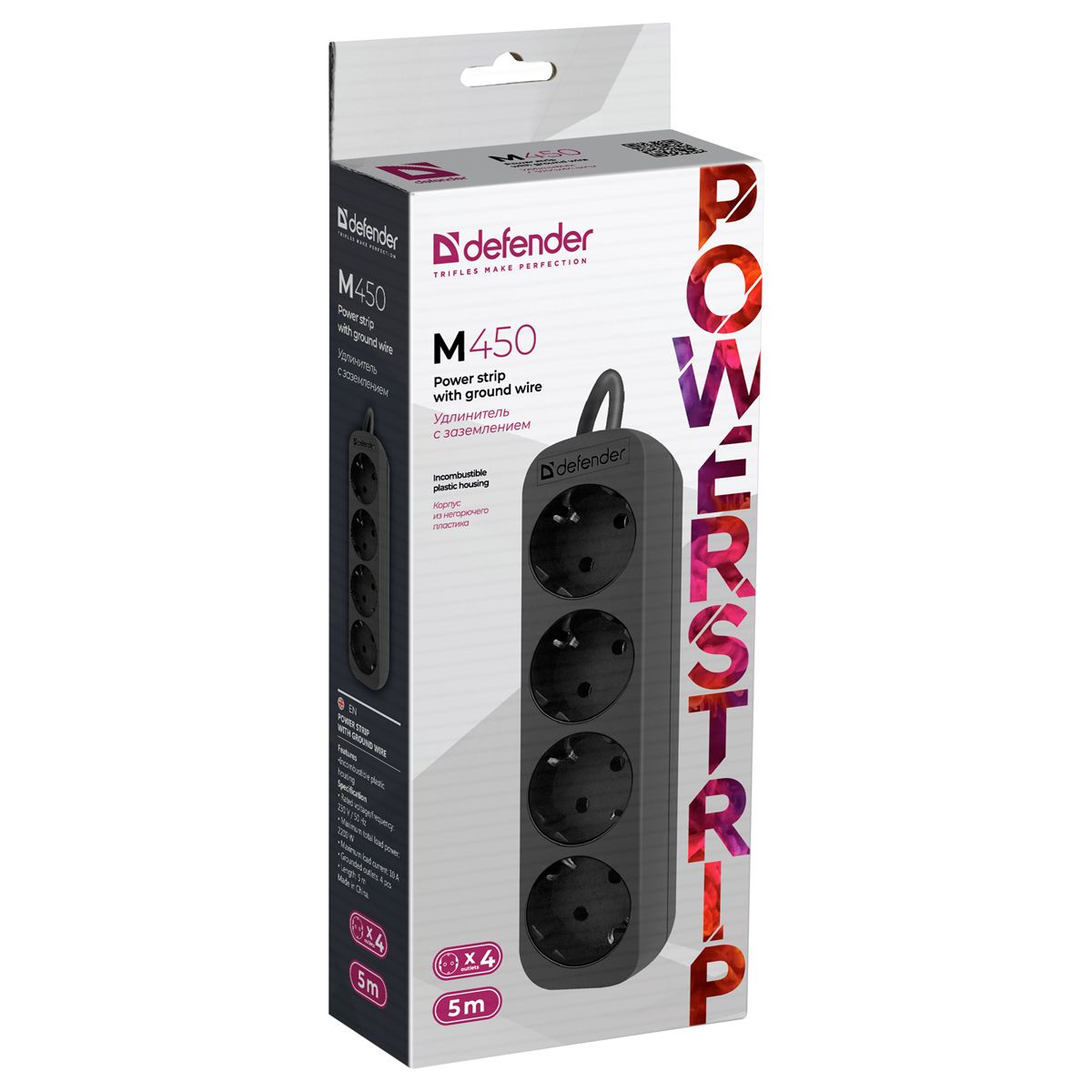 Удлинитель Defender M450, 4 розетки, с заземлением, 5м, черный