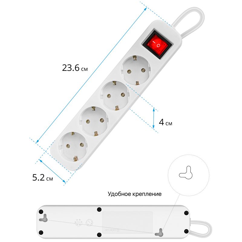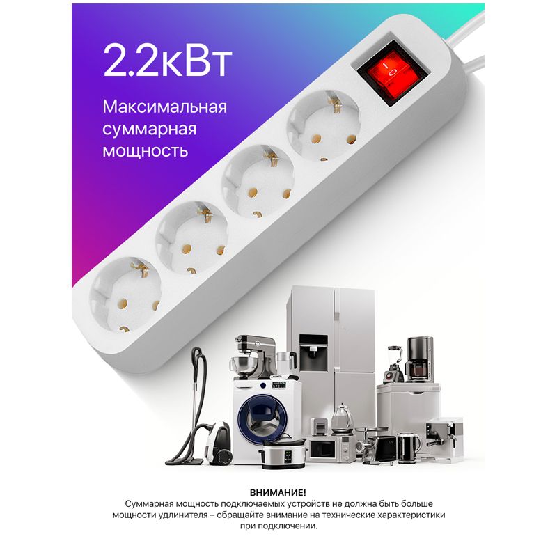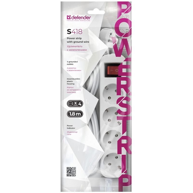 Удлинитель Defender S418, 4 розетки, с заземлением, выключатель, 1,8м, белый
