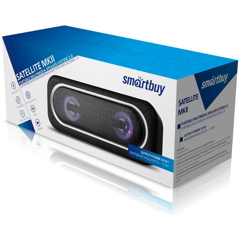 Портативная акустическая система Smartbuy Satellite 2! Прекрасный, чистый звук достигается благодаря двум сателлитам диаметром 50 мм, которые развивают суммарную мощность в целых 10 Вт! Стильный и лаконичный дизайн, приятная подсветка с возможностью отключения, встроенный модуль Bluetooth 5.0, FM радио, встроенный MP3-плеер (USB / microSD).