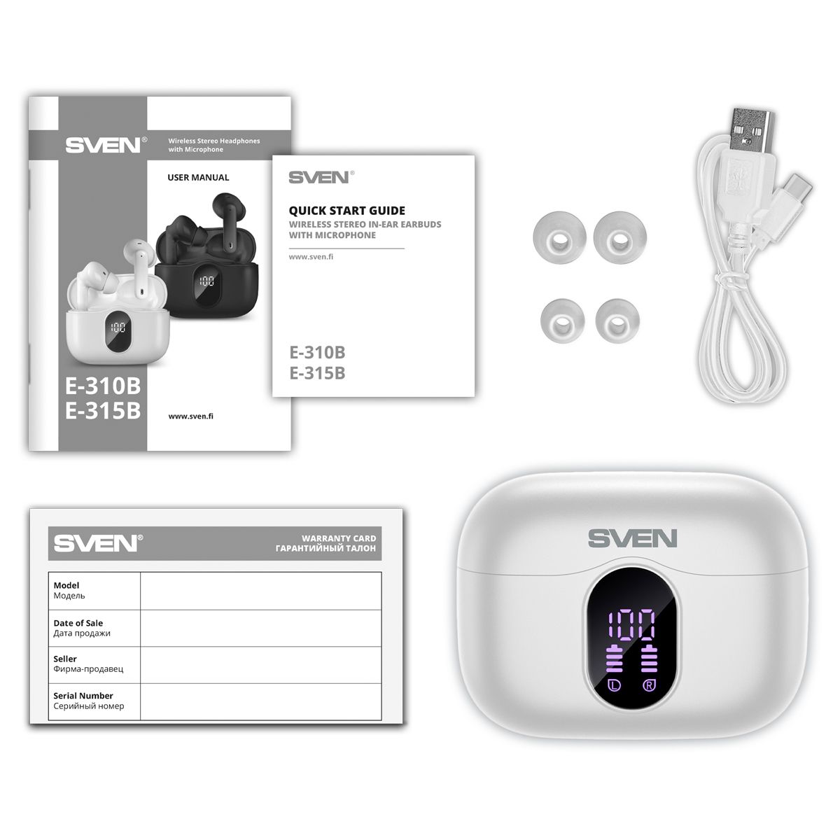 Наушники с микрофоном беспроводные Sven E-310B, TWS Bluetooth, разъем Type-C, белый