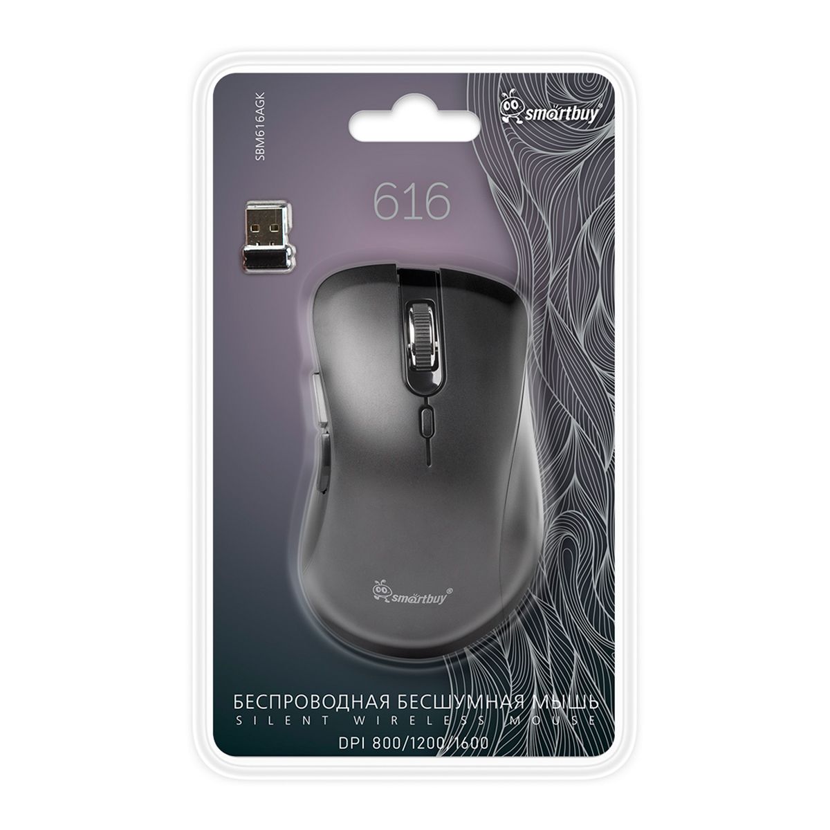 Мышь беспроводная Smartbuy 616AG, бесшумная работа кнопок, черный, 5btn+Roll