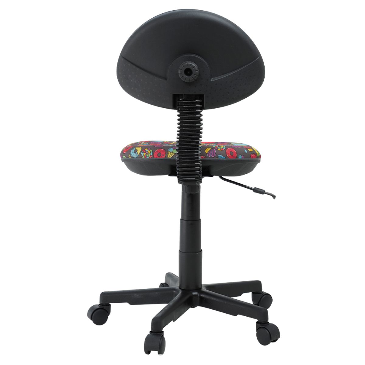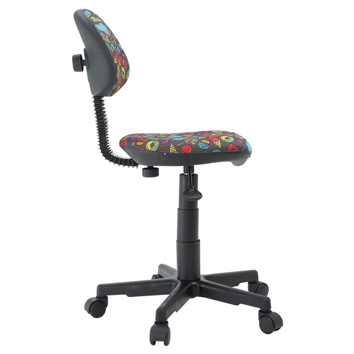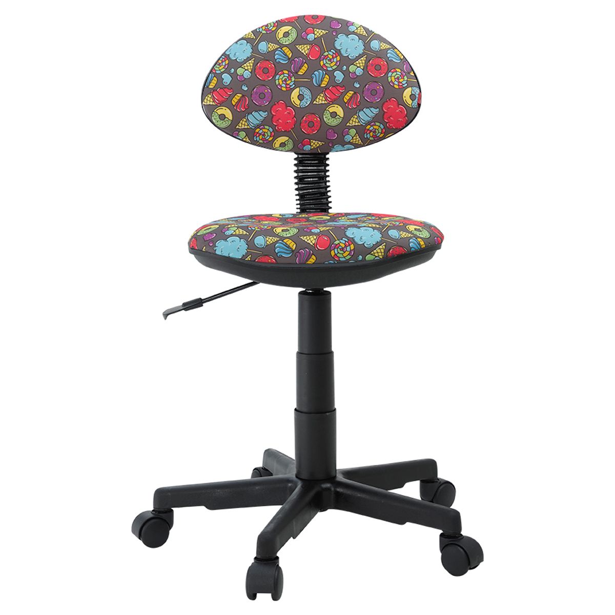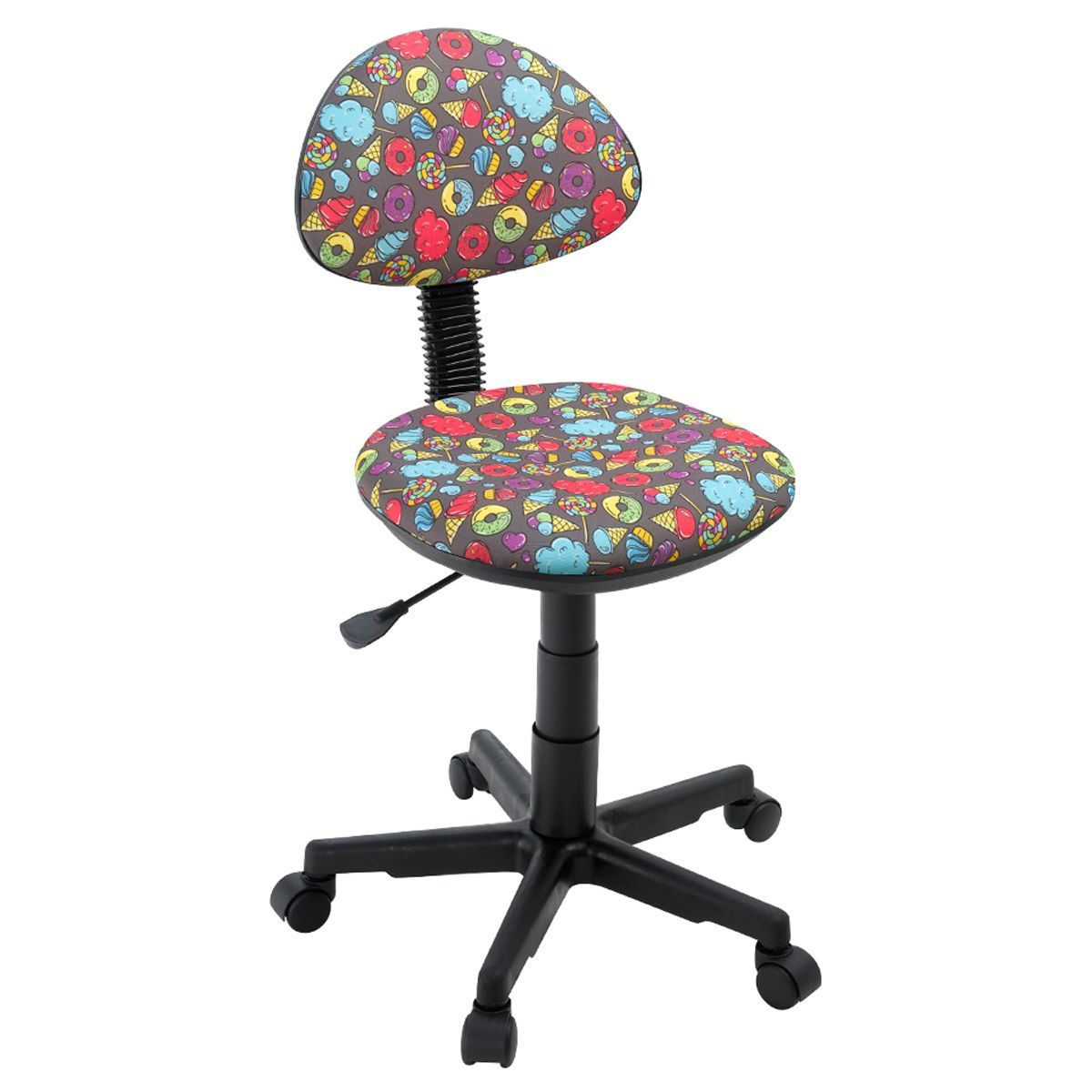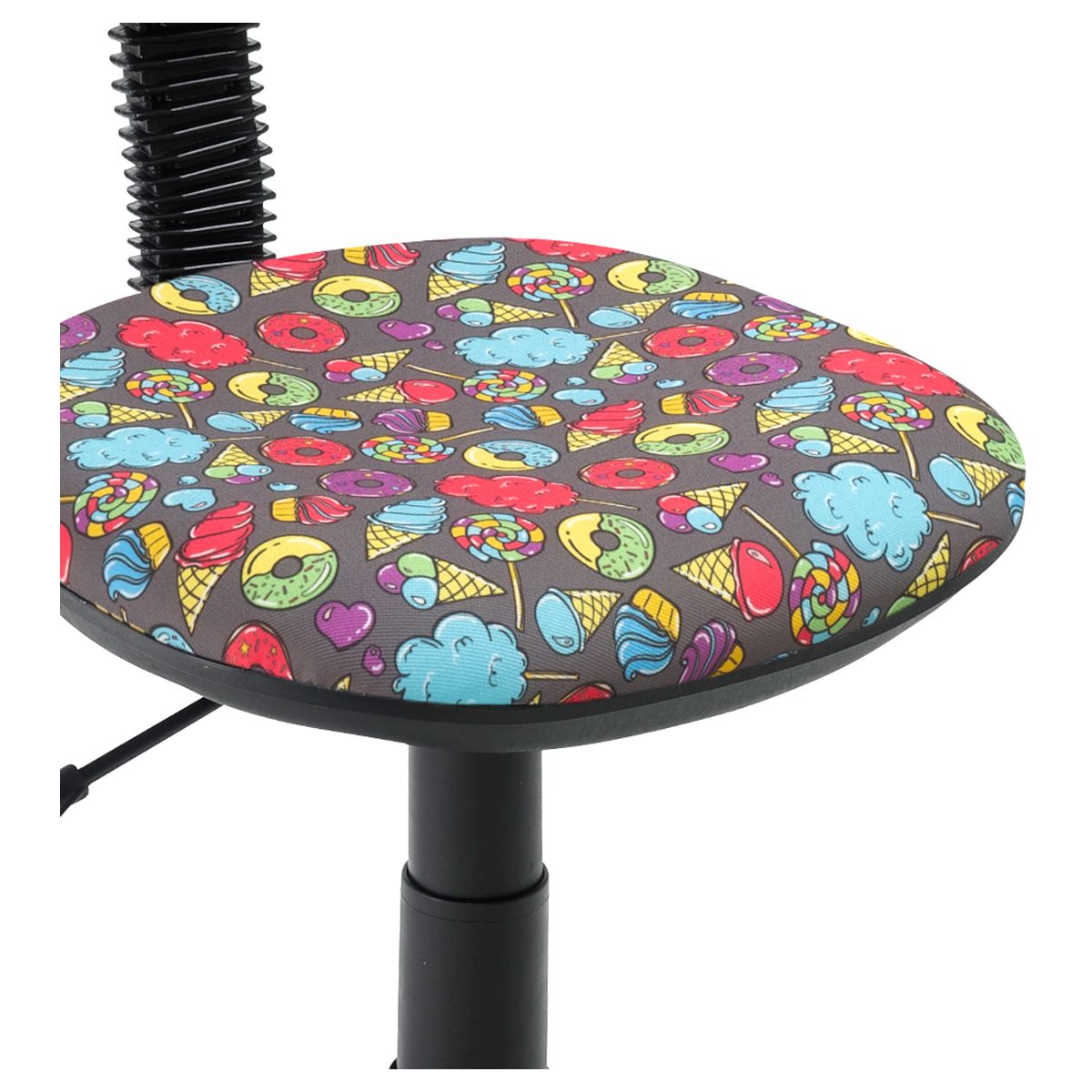 В исполнении на чёрном пластике. Максимальная нагрузка составляет 50 кг. Газпатрон 2 класса. Каркас – немонолитный, материал набивки – поролон, крестовина – пластиковая, без подлокотников. Спинка и сиденье обиты тканью с рисунком «сладости». Без механизма качания, спинка жёстко зафиксирована. Регулировка сиденья по высоте. Гарантийный срок – 1 год. Кресло поставляется в картонной коробке в разобранном виде.
