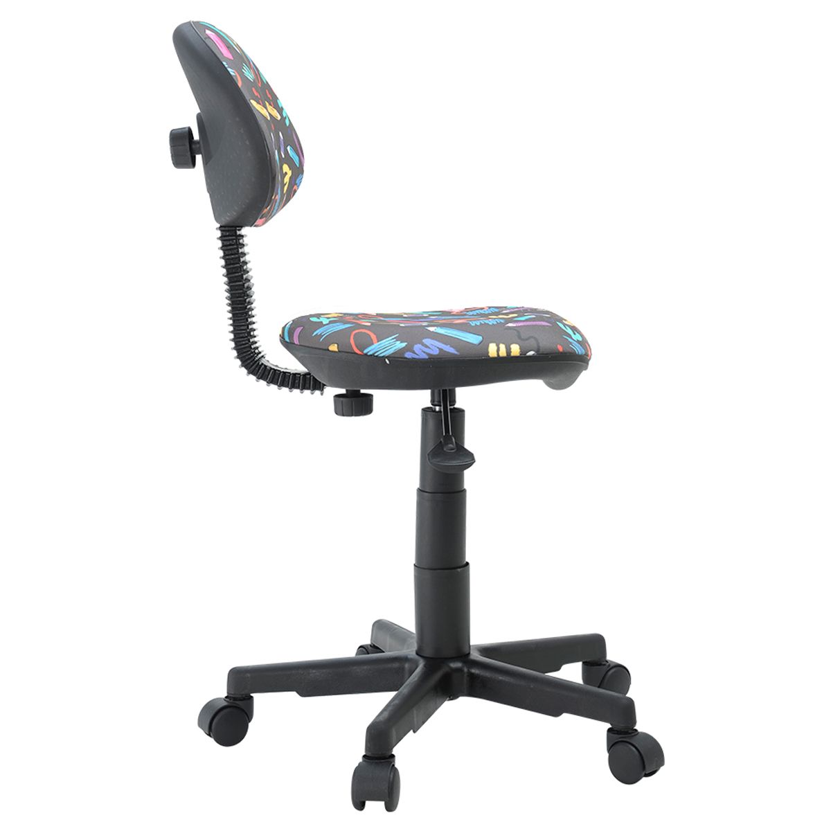 В исполнении на черном пластике. Максимальная нагрузка составляет 50кг. Газпатрон 2 класса. Каркас – немонолитный, материал набивки – поролон, крестовина – пластиковая, без подлокотников. Спинка и сиденье обиты тканью, рисунок графика. Без механизма качания, спинка жестко зафиксирована. Регулировка сиденья по высоте. Гарантийный срок – 1 год. Кресло поставляется в картонной коробке в разобранном виде.