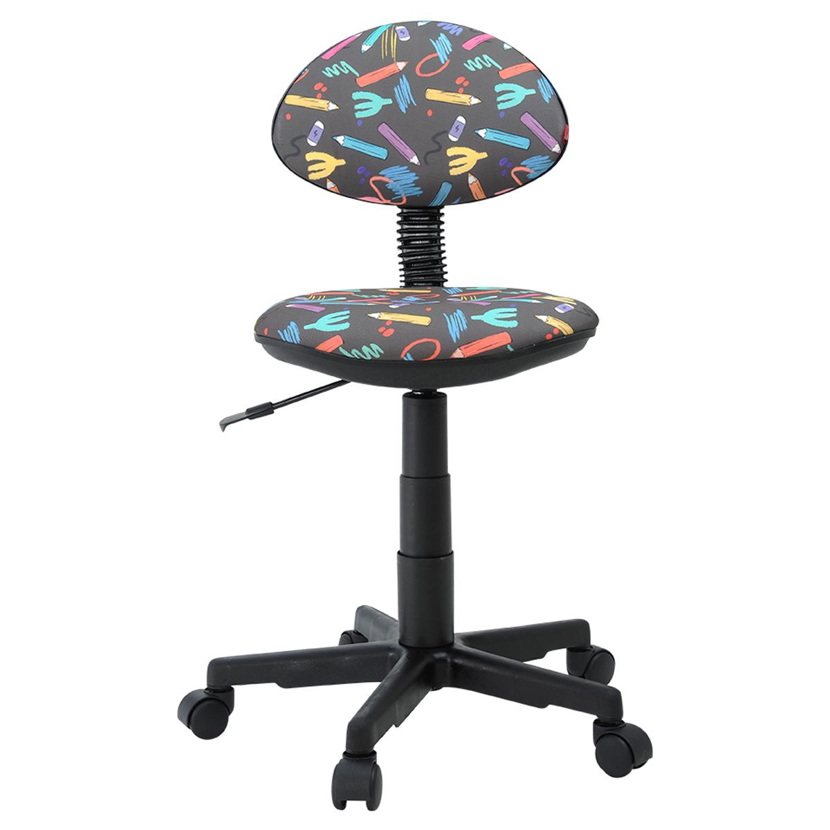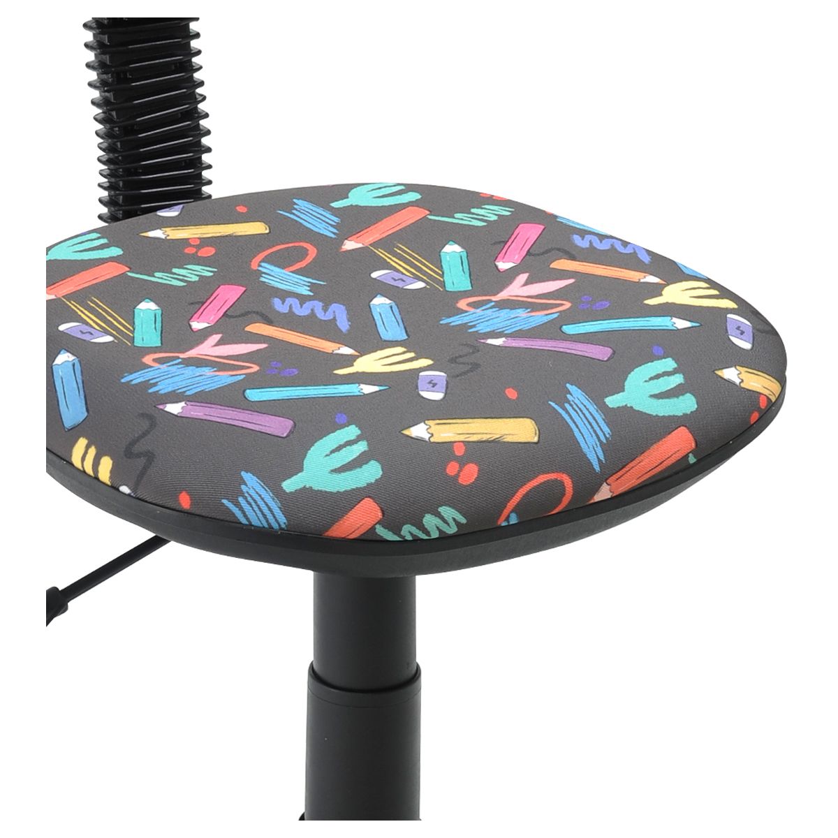 В исполнении на черном пластике. Максимальная нагрузка составляет 50 кг. Газпатрон 2 класса. Каркас – немонолитный, материал набивки – поролон, крестовина – пластиковая, без подлокотников. Спинка и сиденье обиты тканью с рисунком «графика». Без механизма качания, спинка жестко зафиксирована. Регулировка сиденья по высоте. Гарантийный срок – 1 год. Кресло поставляется в картонной коробке в разобранном виде.