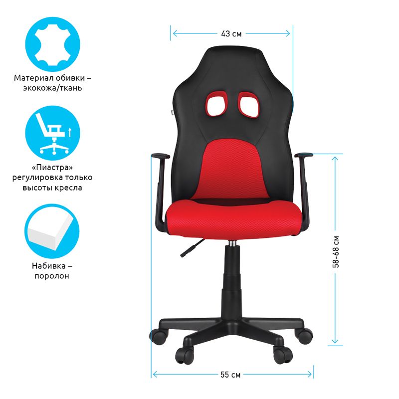 Максимальная нагрузка составляет 120 кг. Газпатрон 2 класса по стандарту BIFMA X5.1. Каркас – немонолитный, материал набивки – поролон, крестовина – пластиковая, подлокотники – пластиковые, материал обивки – экокожа чёрного цвета с красными вставками. Механизм качания «пиастра» – регулировка только высоты кресла. Гарантийный срок – 12 месяцев.