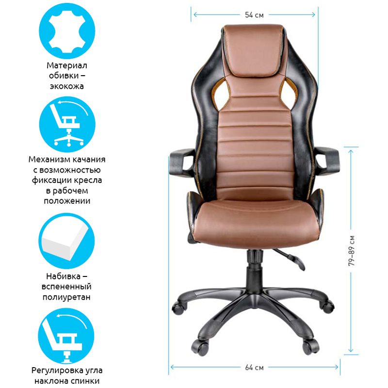 Каркас – немонолитный, материал набивки – вспененный полиуретан, крестовина – пластик, материал подлокотников – пластик, материал обивки – экокожа чёрного и ткань оранжевого цветов. Механизм качания «Люкс» с возможностью фиксации кресла в нескольких положениях. Гарантийный срок – 12 месяцев.