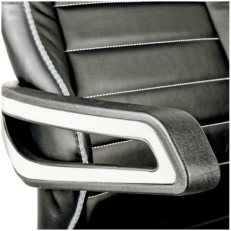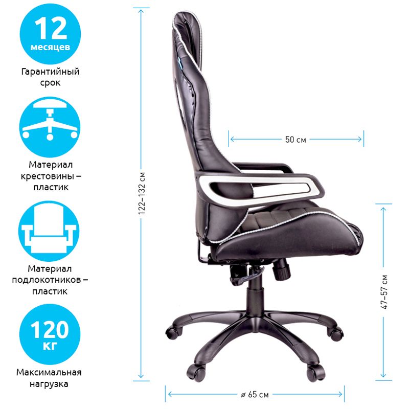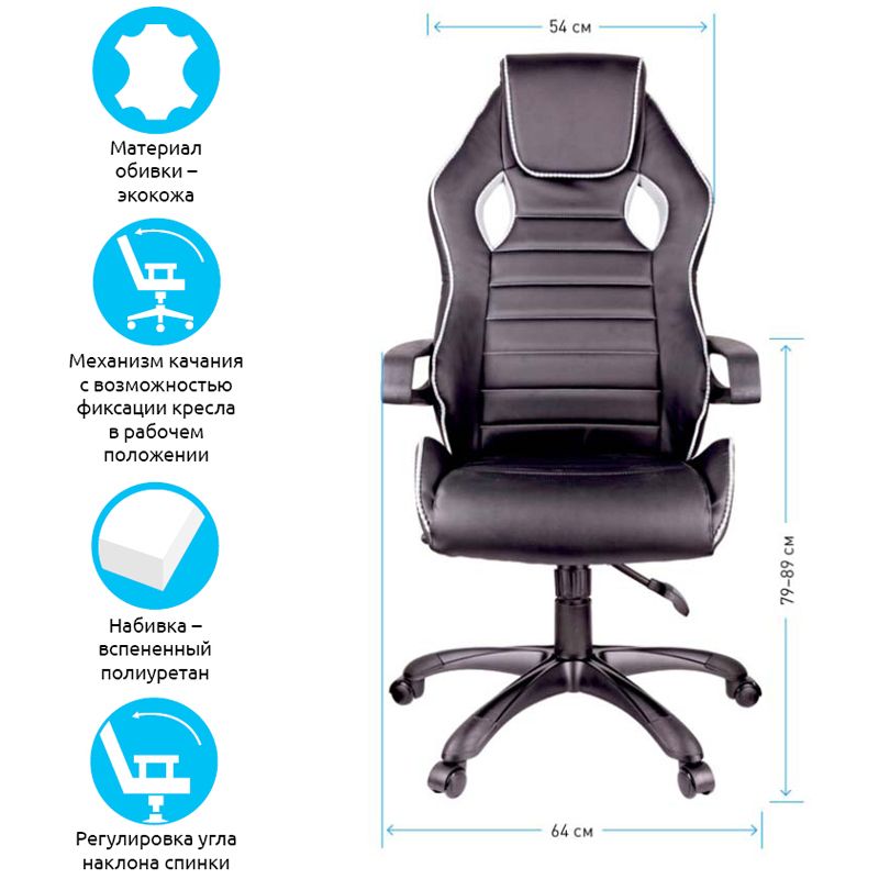 Каркас – немонолитный, материал набивки – вспененный полиуретан, крестовина – пластик, материал подлокотников – пластик, материал обивки – экокожа чёрного и ткань серого цветов. Механизм качания «Люкс» с возможностью фиксации кресла в нескольких положениях. Гарантийный срок – 12 месяцев.