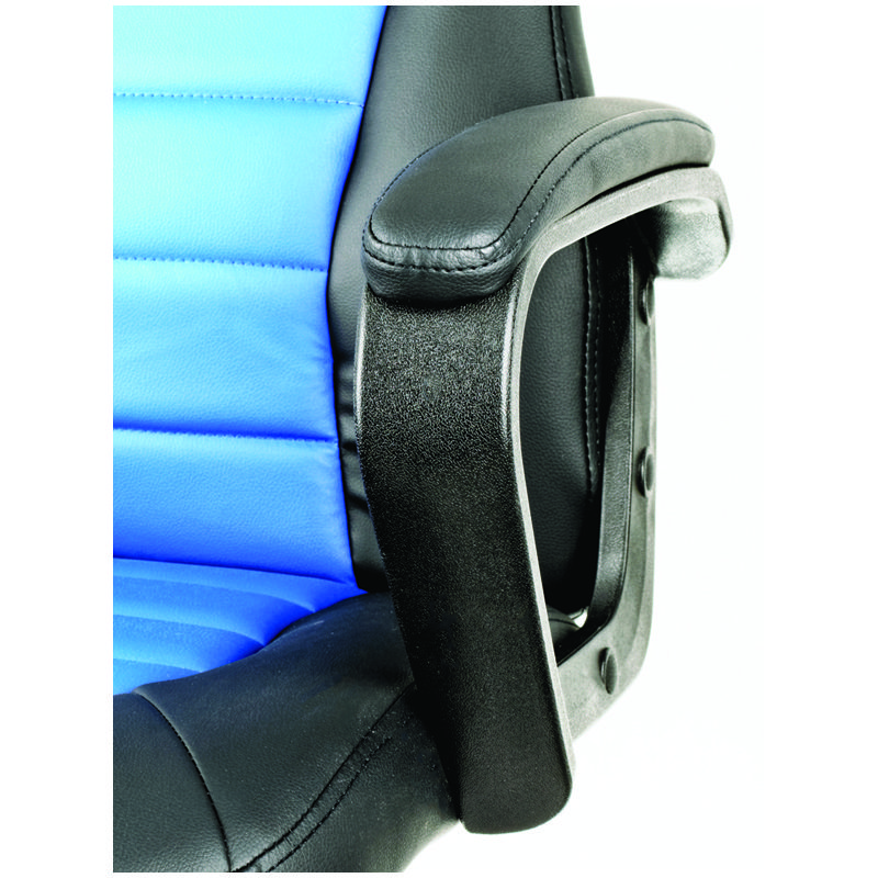Максимальная нагрузка составляет 120 кг. Газпатрон 2 класса по стандарту BIFMA X5.1. Каркас – немонолитный, материал набивки – вспененный полиуретан, крестовина – пластик, материал подлокотников – пластик с накладками из экокожи, материал обивки – экокожа чёрного и синего цветов. Механизм качания с возможностью фиксации кресла в рабочем положении. Гарантийный срок – 12 месяцев.