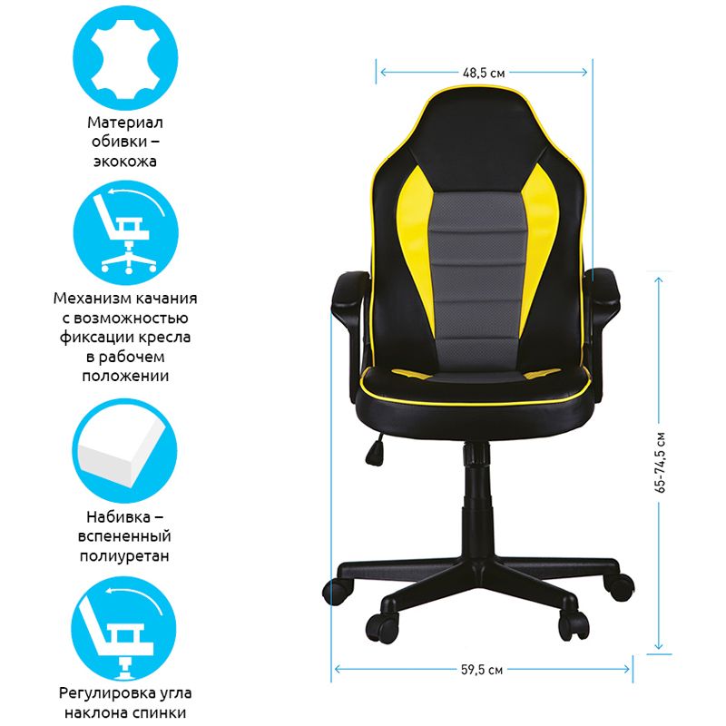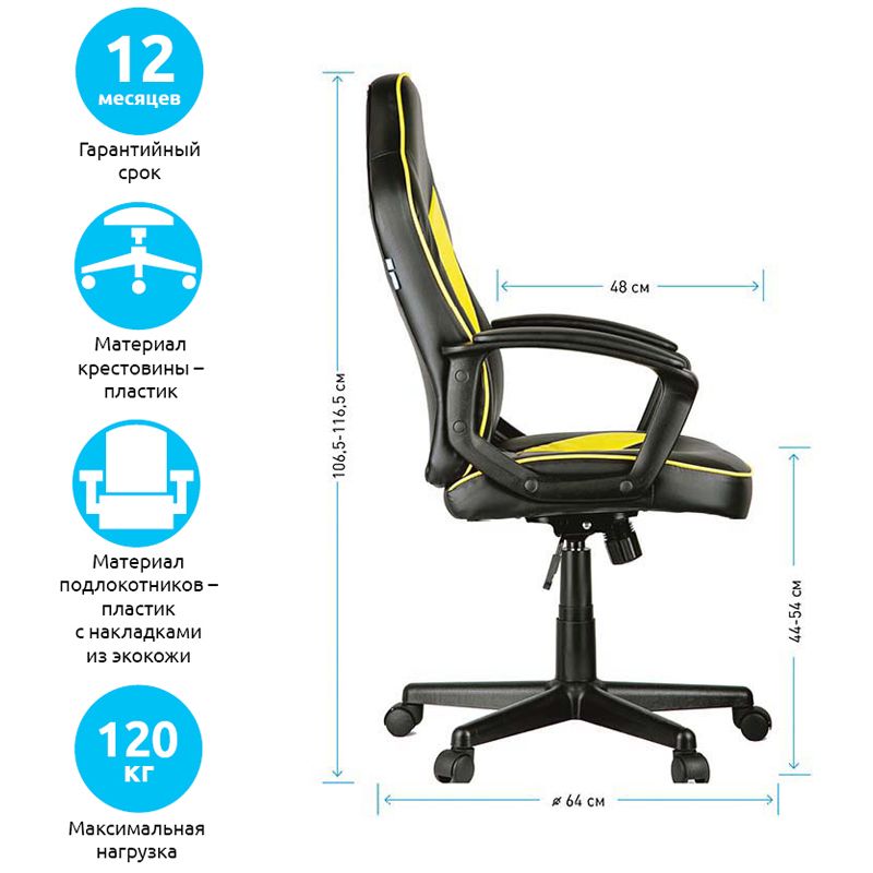 Максимальная нагрузка составляет 120 кг. Газпатрон 3 класса по стандарту BIFMA X5.1. Каркас – немонолитный, материал набивки – вспененный полиуретан, крестовина – пластик, материал подлокотников – пластик с накладками из экокожи, материал обивки – экокожа чёрного, серого и жёлтого цвета. Механизм качания с возможностью фиксации кресла в рабочем положении. Гарантийный срок – 12 месяцев.