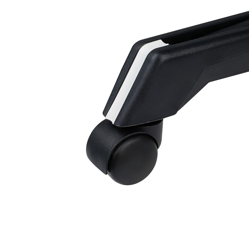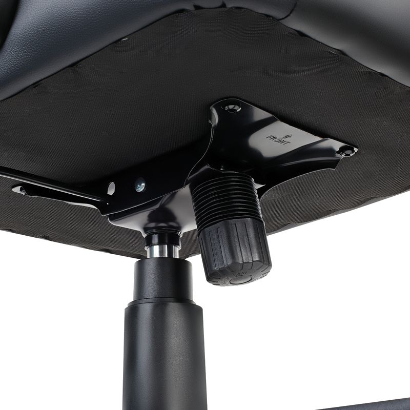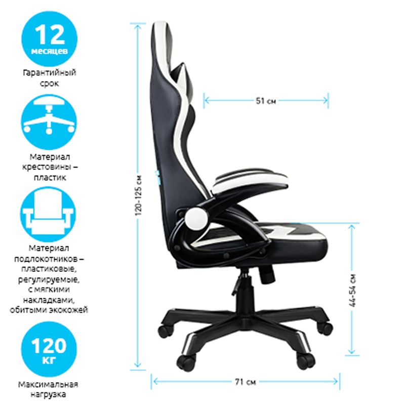 Максимальная нагрузка составляет 120 кг. Газпатрон 2 класса по стандарту BIFMA X5.1. Каркас – немонолитный, материал набивки – вспененный полиуретан, крестовина – пластиковая, подлокотники – пластиковые, регулируемые, с мягкими накладками из экокожи, материал обивки – экокожа чёрного цвета с белыми вставками. Механизм качания с возможностью фиксации кресла в рабочем положении. Гарантийный срок – 12 месяцев.
