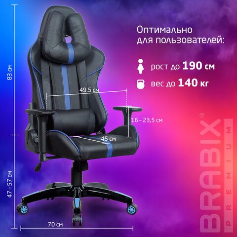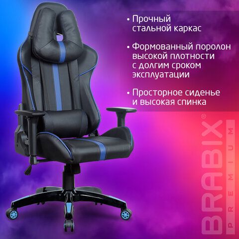 Кресло компьютерное BRABIX "GT Carbon GM-120", две подушки, экокожа, черное/синее, 531930