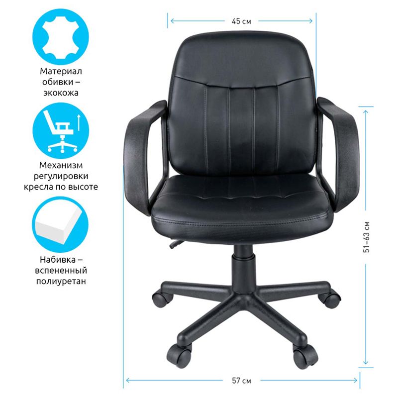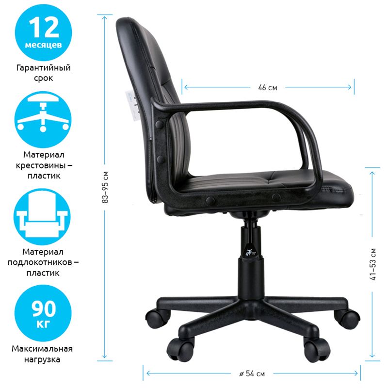 Максимальная нагрузка – 90 кг. Газпатрон 2 категории по стандарту Germany DIN 4550. Каркас – немонолитный, материал набивки – вспененный полиуретан, крестовина – пластик, материал обивки – экокожа черного цвета. Механизм регулировки кресла по высоте. Гарантийный срок – 12 месяцев.