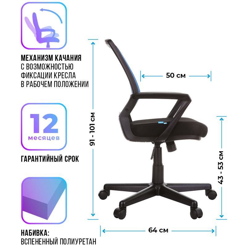 Максимальная нагрузка – 120 кг. Газпатрон 3 класса по стандарту DIN EN 16955. Каркас – немонолитный, материал набивки – вспененный полиуретан, крестовина – пластик, материал обивки – ткань-сетка на спинке синяя, сиденье из ткани TW чёрного цвета. Механизм качания с возможностью фиксации кресла в рабочем положении. Гарантийный срок – 12 месяцев.