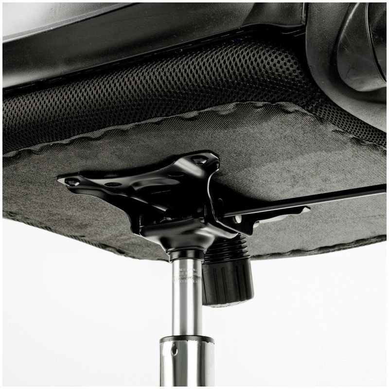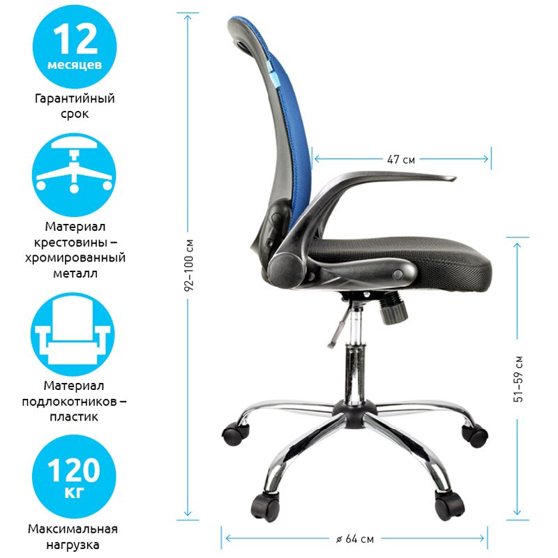 Максимальная нагрузка – 120 кг. Газпатрон 3 класса по стандарту BIFMA X5.1. Каркас – немонолитный, материал набивки – вспененный полиуретан, крестовина – хромированный металл, материал обивки – ткань TW чёрного цвета, сетчатая спинка синего цвета. Механизм качания с возможностью фиксации кресла в рабочем положении. Гарантийный срок – 12 месяцев.