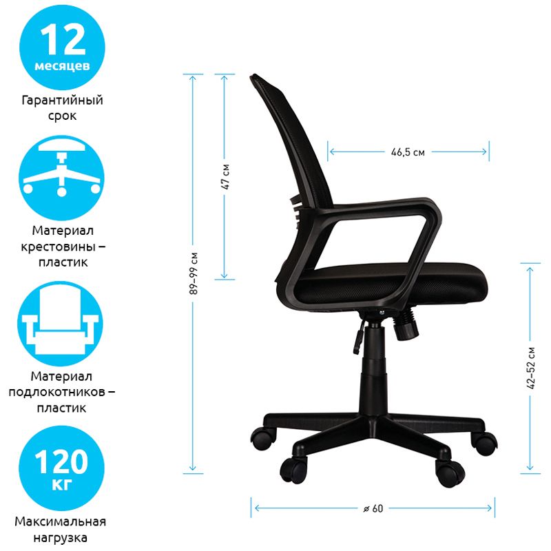 Максимальная нагрузка – 120 кг. Газпатрон 2 класса по стандарту BIFMA X5.1. Каркас – немонолитный, материал набивки – вспененный полиуретан, крестовина – пластик, материал обивки – ткань/сетка чёрного цвета. Механизм регулировки кресла по высоте. Гарантийный срок – 12 месяцев.