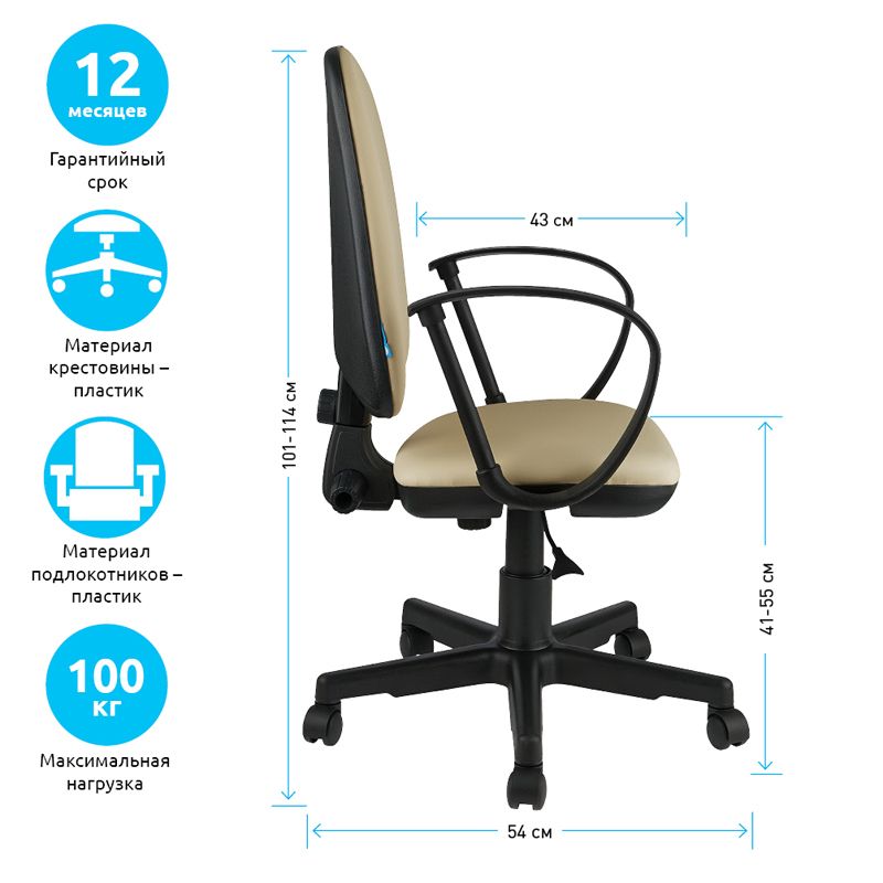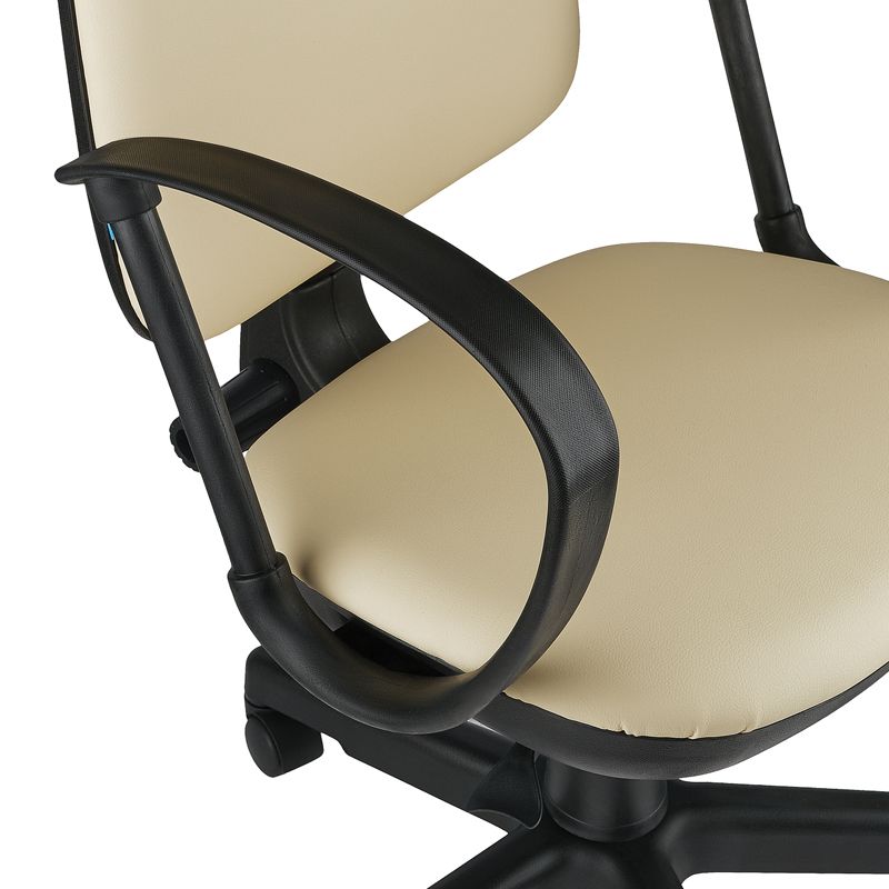 Максимальная нагрузка – 100 кг. Газпатрон 2 категории. Каркас – немонолитный, материал набивки – поролон, крестовина – пластик, материал обивки – бежевая экокожа. Механизм регулировки кресла по высоте, со свободным ходом отклонения спинки кресла и регулировкой жесткости, но без какой-либо фиксации.
