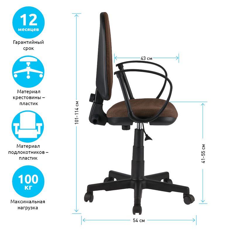 Максимальная нагрузка – 100 кг. Газпатрон 2 категории. Каркас – немонолитный, материал набивки – поролон, крестовина – пластик, материал обивки – ткань коричнево-бежевого цвета. Механизм регулировки кресла по высоте, со свободным ходом отклонения спинки кресла и регулировкой жесткости, но без какой-либо фиксации.