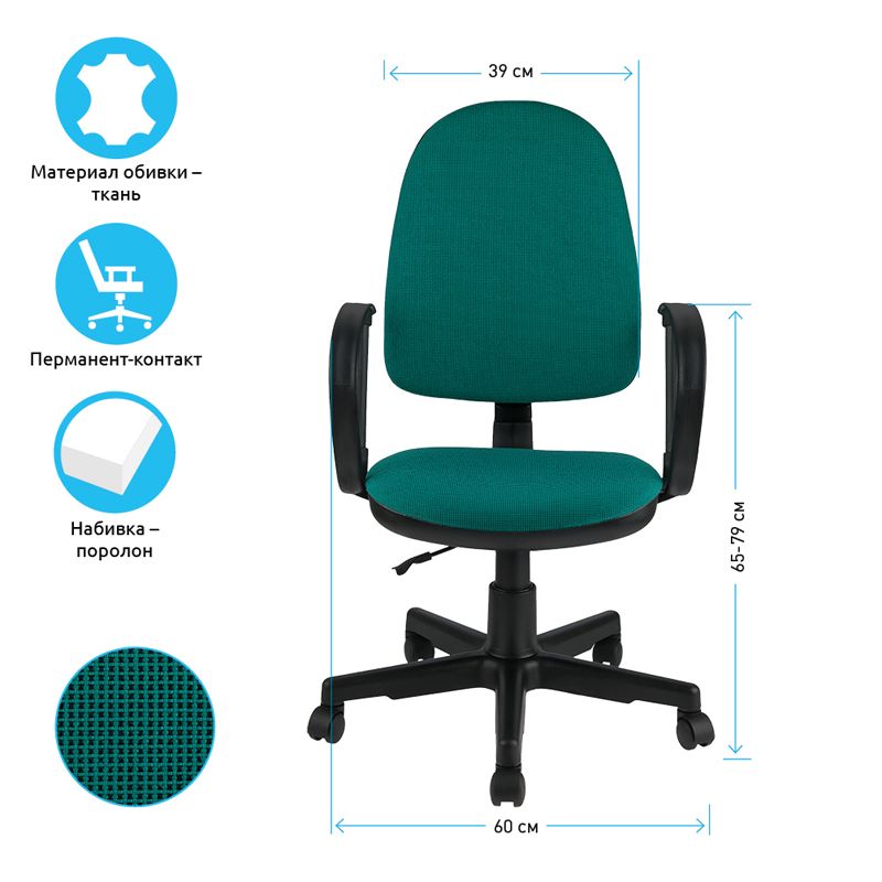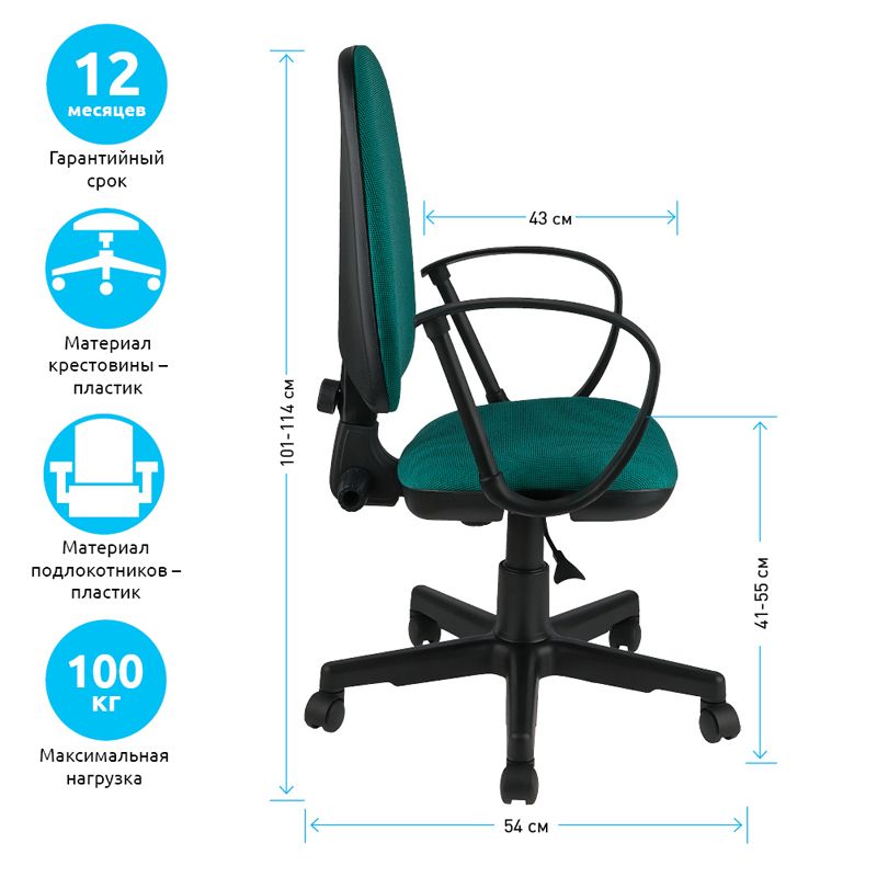 Максимальная нагрузка – 100 кг. Газпатрон 2 категории. Каркас – немонолитный, материал набивки – поролон, крестовина – пластик, материал обивки – ткань зелёного цвета. Механизм регулировки кресла по высоте, со свободным ходом отклонения спинки кресла и регулировкой жесткости, но без какой-либо фиксации.
