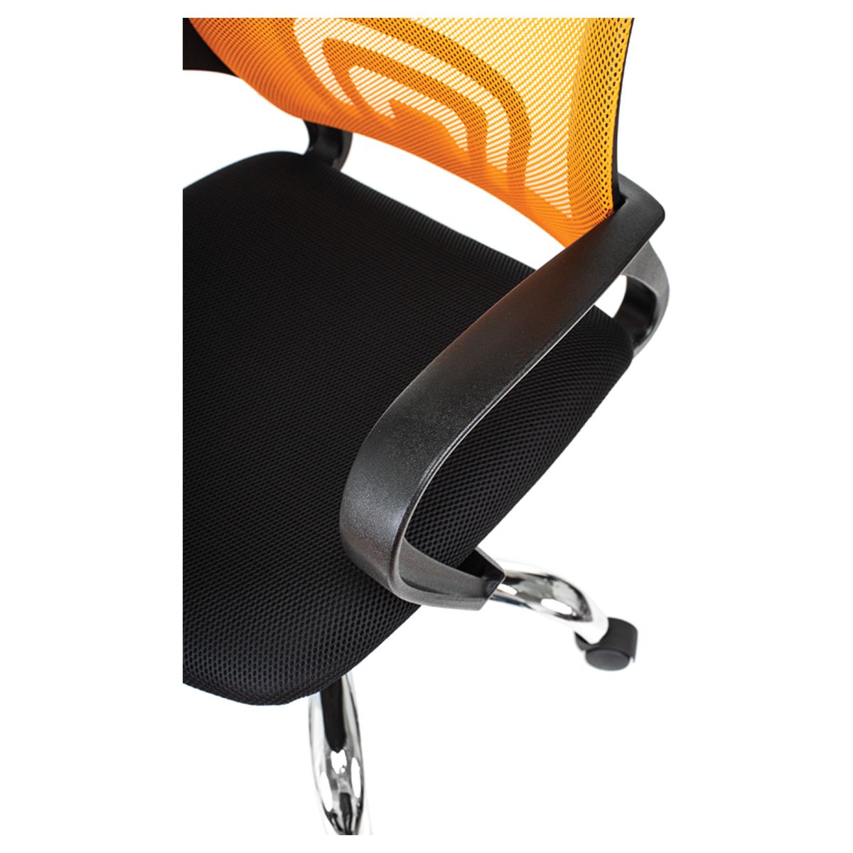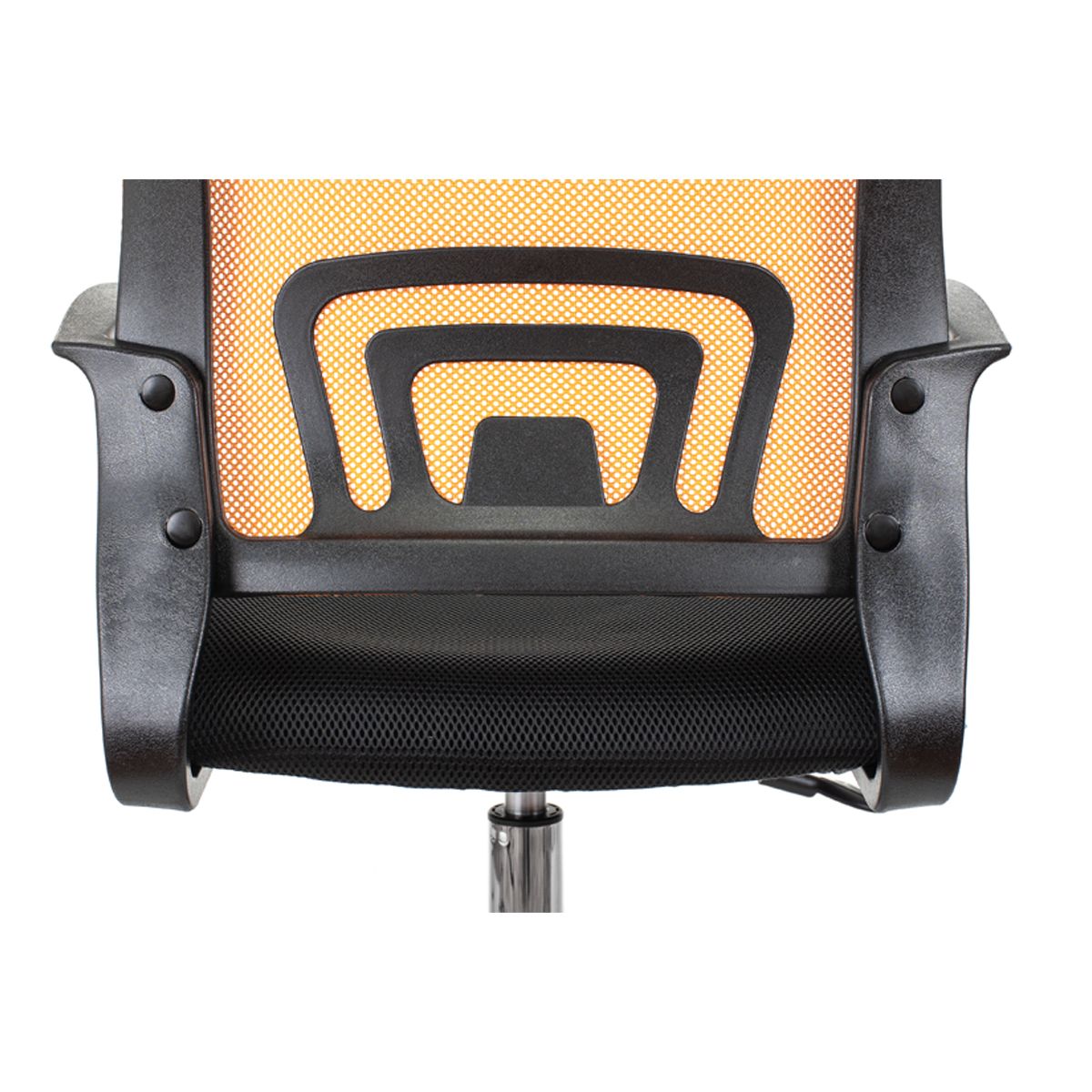 Максимальная нагрузка составляет 120 кг. Газпатрон 3 класса по стандарту Germany DIN 4550. Каркас – немонолитный, материал набивки – поролон, крестовина – хромированный металл, подлокотники изготовлены из пластика. Спинка из сетчатого акрила оранжевого цвета подстраивается под физиологические изгибы спины. Сиденье выполнено из ткани чёрного цвета. Без механизма качания. Регулировка кресла по высоте. Гарантийный срок – 3 года. Кресло поставляется в картонной коробке в разобранном виде.