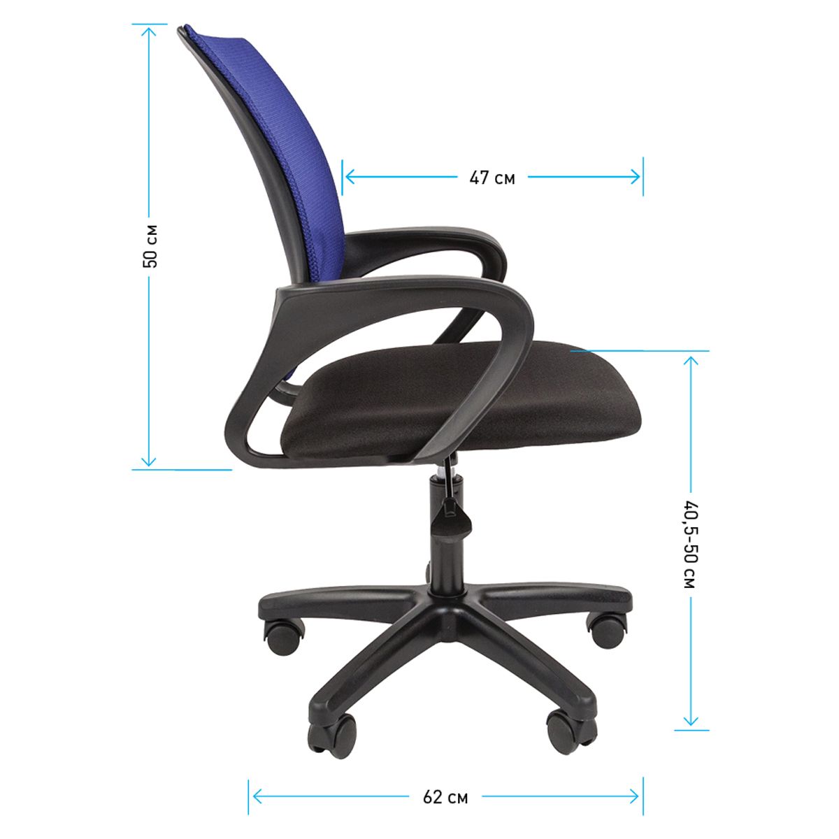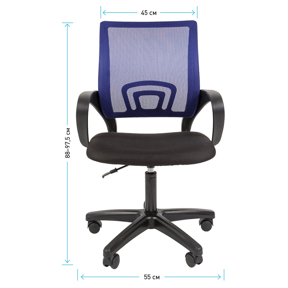Максимальная нагрузка составляет 120 кг. Газпатрон 2 класса по стандарту Germany DIN 4550. Каркас – немонолитный, материал набивки – поролон, крестовина – пластиковая, подлокотники тоже изготовлены из пластика. Спинка из сетчатого акрила синего цвета подстраивается под физиологические изгибы спины. Сиденье выполнено из ткани чёрного цвета. Присутствует механизм регулировки кресла по высоте. Гарантийный срок – 2 года. Кресло поставляется в картонной коробке в разобранном виде.